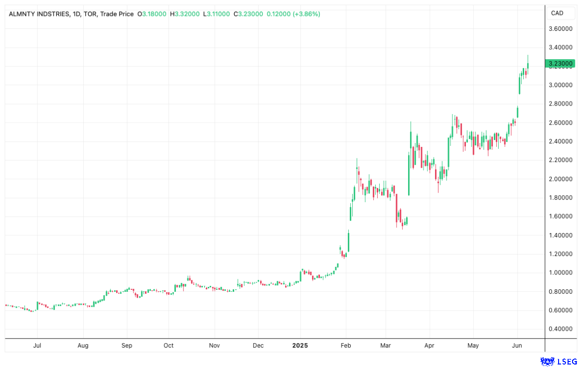 Die Aktie von Almonty Industries ist in den letzten 18 Monaten bereits deutlich angestiegen. Die geopolitischen Umstände lassen eine weitere Eskalation zwischen China und den USA nicht ausschließen und damit dürfte die Rohstoffversorgung von Metallen wie Wolfram weiter unter Druck geraten. Für Produzenten wie Almonty Industries bedeutet das höhere Absatzpreise und deutlich höhere Gewinnmargen, sodass die Analysten ggf. zum Jahresende 2025 bereits ihren Ausblick für die kommenden Jahre mit höheren Kurszielen anpassen müssten.