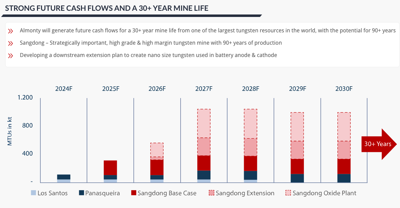 In den letzten Jahren investierte Almonty Industries enorme Summen an Kapital in den Auf- und Ausbau der unternehmenseigenen Wolframmine Sangdong in Südkorea. Dieser Aufbau wurde u. a. durch Eigenkapital, aber auch durch einen Projektkredit der KfW-IPEX-Bank in Höhe von 75,1 Mio. USD finanziert. Der Abschluss des Auf- & Ausbaus der ersten Phase der Produktionslinie steht unmittelbar bevor. Die letzten Montagearbeiten an den Verarbeitungsanlagen werden noch durchgeführt und nach den ersten Probetestläufen und der Abnahme der Anlagen durch Almonty wird die Produktion von Wolfram aus der Sangdong-Mine beginnen. Ab dem dritten Quartal 2025 erfolgt dann das planmäßige Hochfahren der Produktion und damit beginnt auch das signifikante Ansteigen der Umsatzkurve des Unternehmens.
