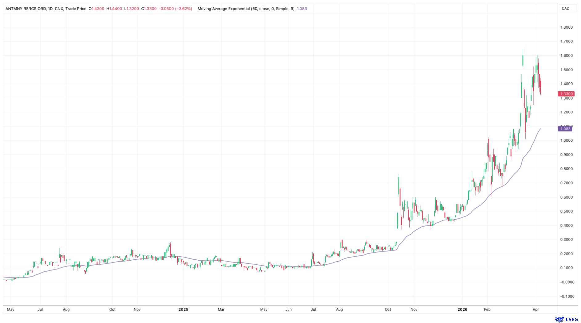 Nach den starken Kursanstiegen der letzten Quartale konsolidierte die Aktie von Antimony Resources in den vergangenen Tagen und notierte zuletzt bei 1,33 CAD. Der EMA-50 auf Tagesbasis verläuft derzeit bei 1,09 CAD. Ein Rücksetzer auf diese Durchschnittslinie bzw. die anschließende Unterstützungszone von 1,00 CAD könnte als interessante Einstiegschance angesehen werden.