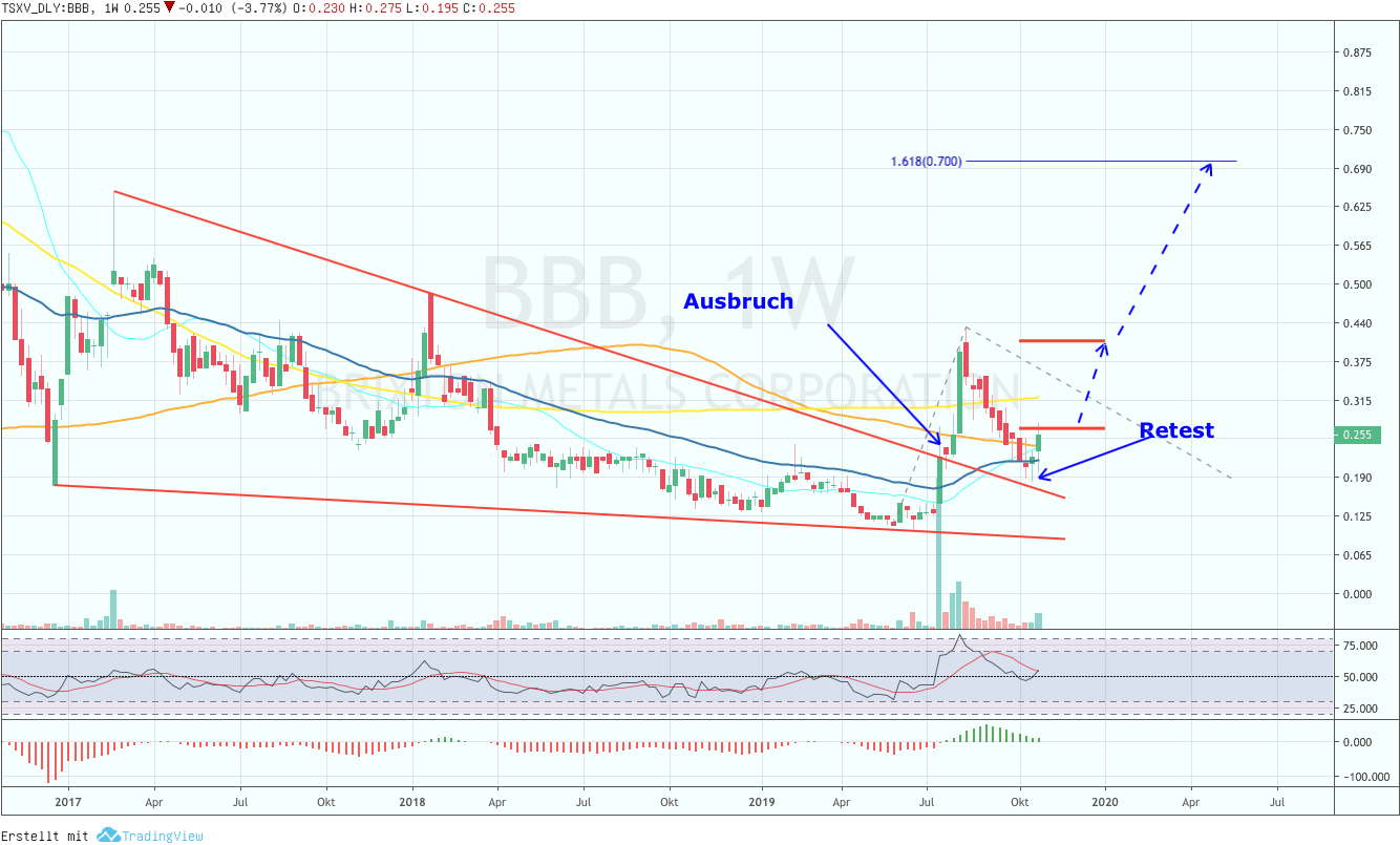 Der Wochenchart von Brixton Metals zeigt ein sich über 2 1/2 Jahre bildendes zusammenziehendes fallendes Dreieck. Im Juli dieses Jahres brach die Aktie aus dem Dreieck gen Norden aus, bildet am 12. August einen Hochpunkt, um dann bis 22. Oktober einen klassischen Retest an der umfunktionierten Unterstützungslinie hinzulegen.