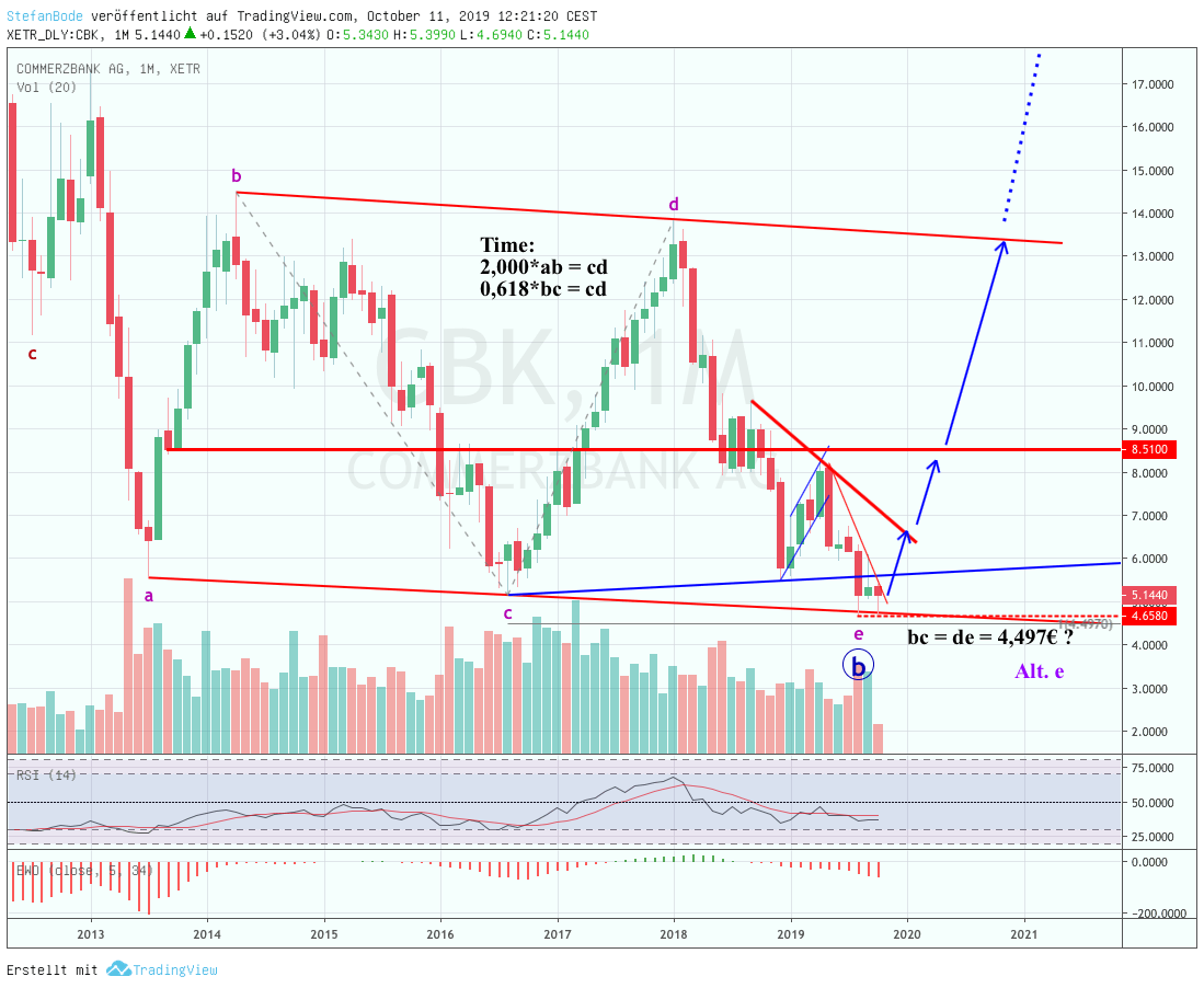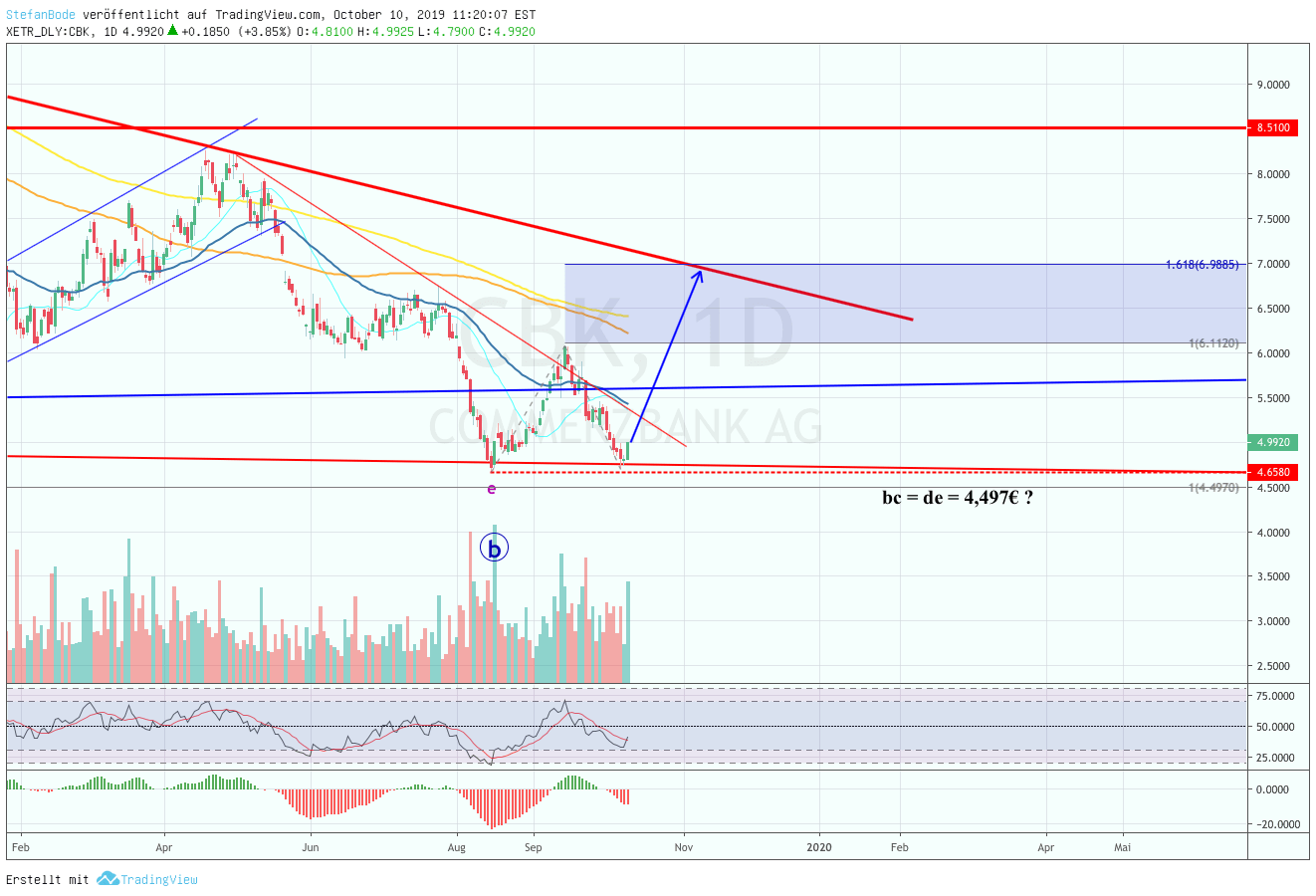 Die Commerzbank Aktie konnte nach dem Rücklauf bis 4,69 Euro am Dienstag, den 08.10.2019 fast ein neues AZT - AllZeitTief ausbilden. Doch kurz vor dem Tiefpunkt fand eine Trendumkehr statt. Aus fundamentaler Sicht dürfte sich an der schlechten Lage der Finanzindustrie nichts geändert haben, im Gegenteil, der Margendruck wird immer höher. Ist die Aktie aber unter charttechnischen Gesichtspunkten ein Kauf wert? Mehr dazu hier: