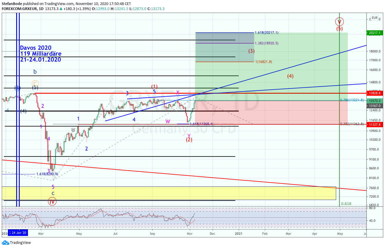 Als erstes muß das letzte Hoch bei 13.463 Punkten diese Woche aus dem Markt genommen werden, damit das Allzeithoch bei 13.829 Punkten und das nächstes Zwischenziel bei 14.200 Punkten abgearbeitet werden kann.