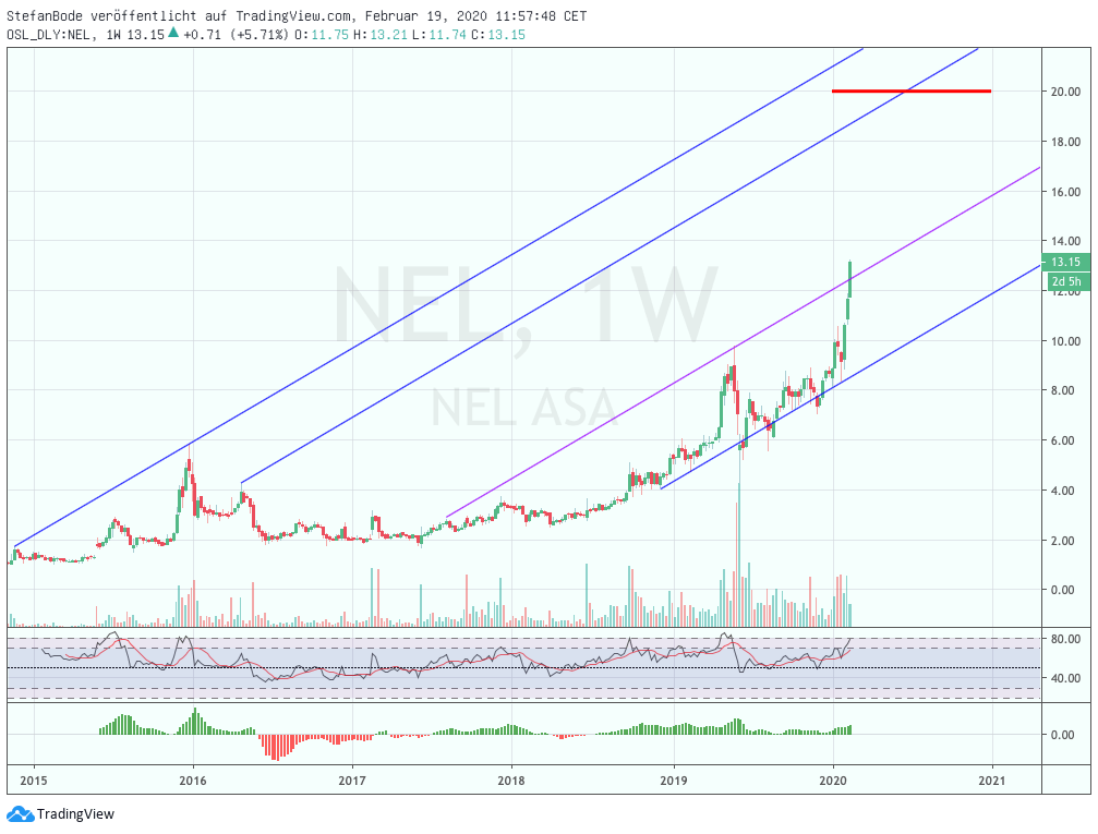 Die Aktie der Norweger liefert auf Grund der jungen Kurshistorie die geringsten Anlaufpunkte. Durch den Ausbruch über die lila dargestellte Trendlinie, wäre ein nächster Anlaufbereich auf der Oberseite die psychologische Marke von 20 NOK. Das wären vom aktuellen Kurs i.H.v. 13,17 NOK ein weiterer Anstieg von über 50 Prozent. Dies ist durchaus bis Sommer 2020 erreichbar, sofern der Hype um Wasserstoff weiter befeuert wird. Ob diese Vorschusslorbeeren nachhaltig sind, wird die Zukunft zeigen, denn auch Rücksetzer zur unteren blauen Trendlinie sind nicht auszuschließen.