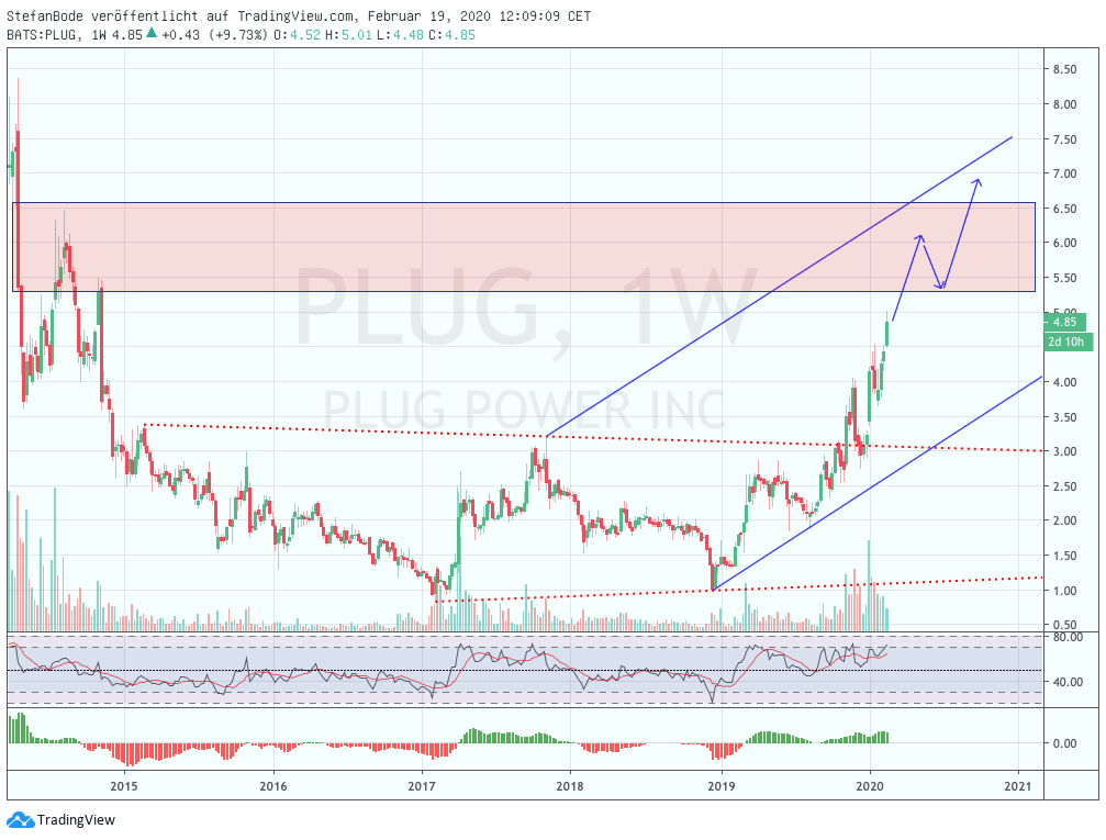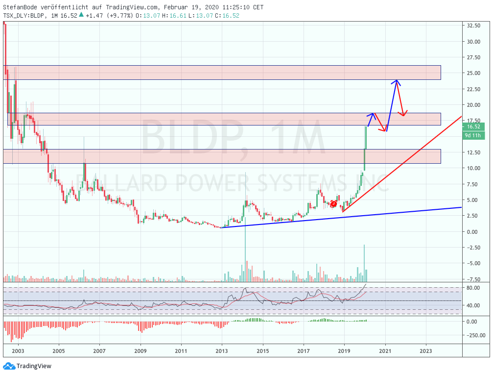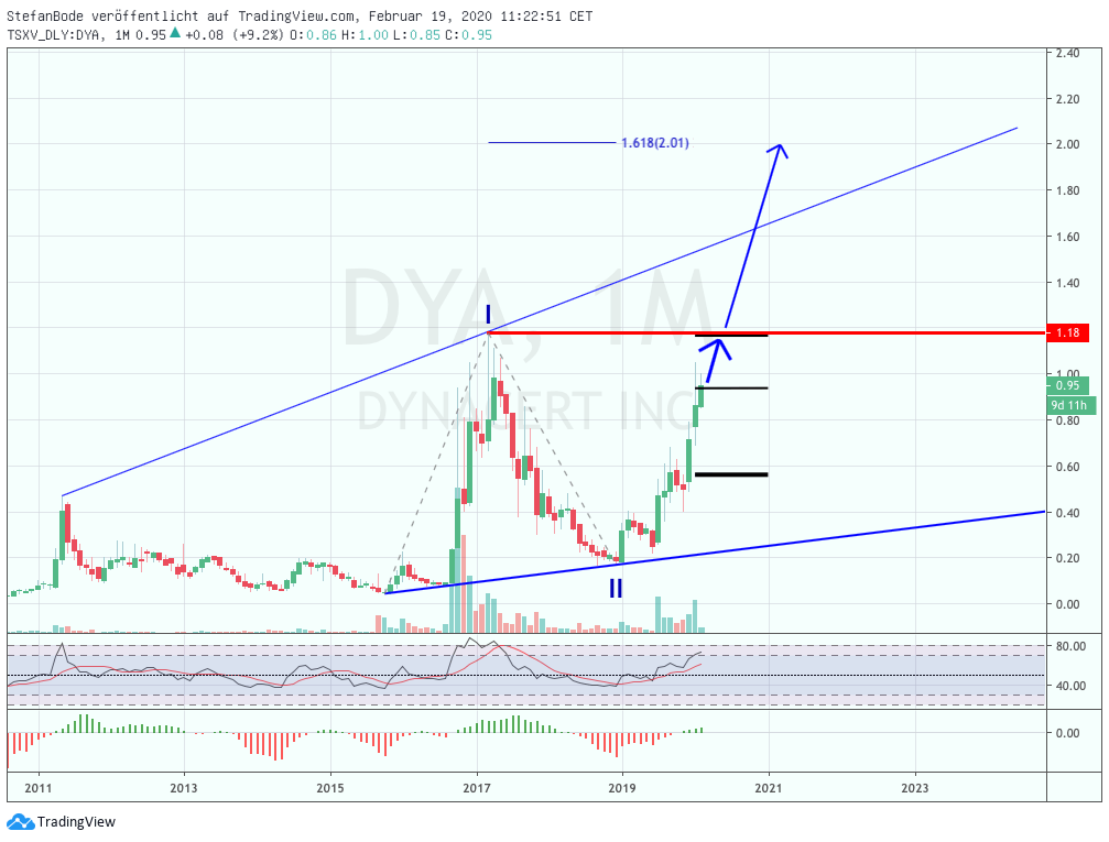 Die ebenfalls aus Kanada stammende dynaCERT Inc. ist charttechnisch bisher noch nicht ausgebrochen, konnte aber seit Dez. 2018 um ca. 460 Prozent zulegen. Ein Ausbruch wäre erst mit überwinden der 1,18 CAD und einem höheren Hoch der Fall. Das Potential für die Aktien bis dorthin liegt allein schon bei ca. 20 Prozent. Im Sog des „Wasserstoff-Hypes“ könnte das bereits im Laufe des Februars erreicht werden. Bei Ausbruch über die 1,18 CAD ist der nächste Anlaufbereich die 2,01 CAD und entspricht dem 1,618-fachen der ersten Aufwärtsbewegung im Jahr 2016. Das wäre vom aktuellen Stand von 0,95 CAD je Aktie mehr als eine Verdopplung. Wichtig ist aber ein Monatsschlußkurs über 1,18 CAD, sonst drohen Gewinnmitnahmen das Chartbild einzutrüben.