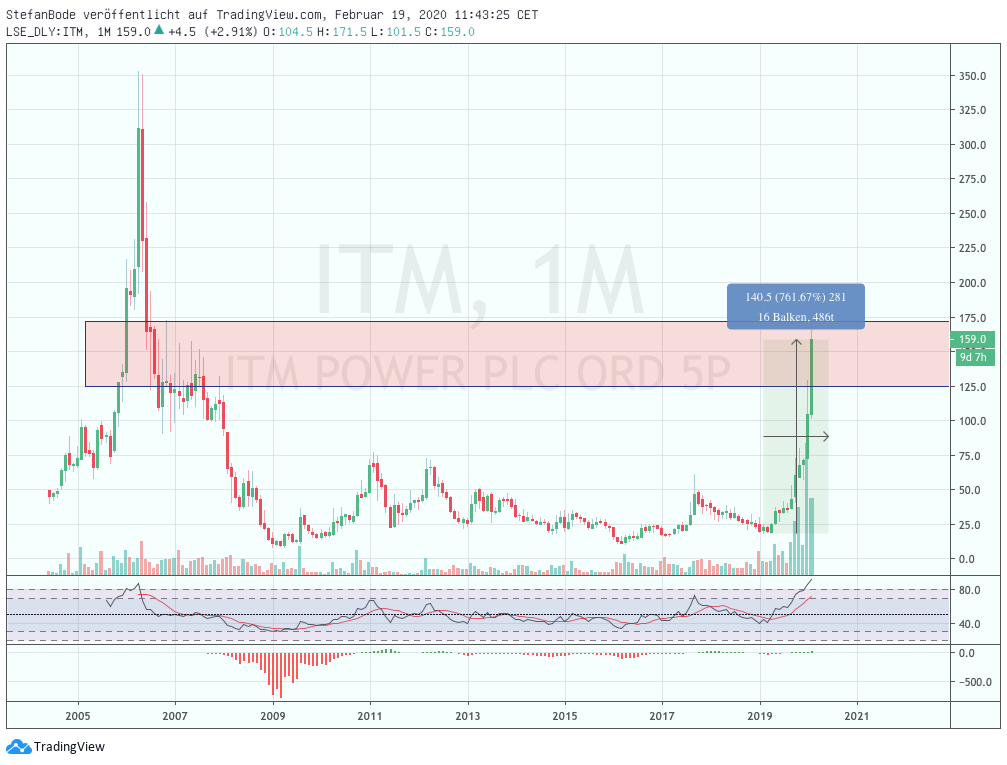 Die Aktie von ITM Power konnte seit Februar 2019, um sagenhafte 760 Prozent zu legen. Jedoch befindet sich die Aktie bereits am oberen Ende der Widerstandszone die sich im Bereich von 125-172 Pence je Aktie erstreckt. Diesen Bereich konnte die Aktie zuletzt vor 14 Jahren überwinden. Sollte die weit gelaufene Aktie von ITM Power keinen Wochenschluss über 172 Pence erzielen, so sollten Aktionäre vorsichtig werden und über Gewinnmitnahmen nachdenken, denn die nächste Unterstützung liegt erst wieder im Bereich von 90-100 Pence.