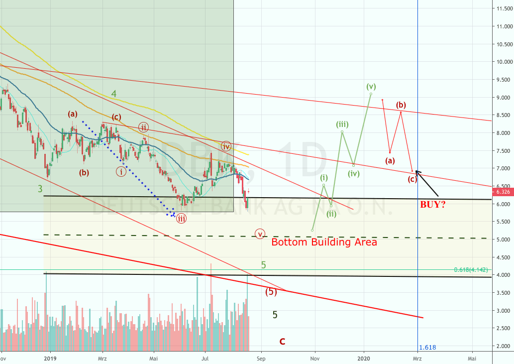 Aus meiner Charttechnischen Brille ist die Aktie der Deutschen Bank nun langsam in die Bodenbildungsphase eingetreten. Auf diese habe ich nun über 1 Jahr gewartet sie sollte im Bereich von € 4 - € 6 beginnen. Genau in dieser Zone wurden die Aktien nun am 31. Mai 2019 und 16. August verstärkt nachgefragt.