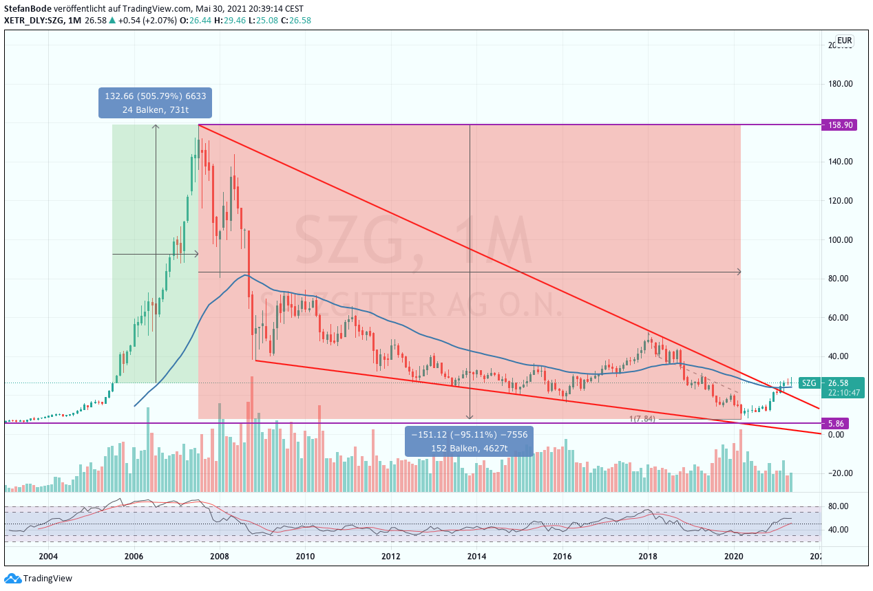 Auch charttechnisch hat sich die Lage beim Stahlkonzern deutlich aufgehellt. 13 lange Jahre war mit der Aktie der Salzgitter AG kein Staat zu machen. Doch das März 2020 Tief leitete die Trendwende ein. Im Februar 2021 konnte dann auch der langjährige Abwärtstrend durchbrochen und die 200er Moving Average Wochenlinie angelaufen werden. Auf dem aktuellen Niveau von 26,58 Euro je Aktie befindet sich die Aktie auf demselben Niveau wie im Sommer 2005. Damals erfolgte eine sensationelle Boomphase der Salzgitter Aktie und innerhalb von zwei Jahren ergab sich ein Zuwachs des Aktienkurses um 505 Prozent. Ob es dieses Mal auch so kommt und der Kurs durch den Zukauf von Günter Papenburg soweit hochgetrieben werden kann, wird die Zukunft zeigen.