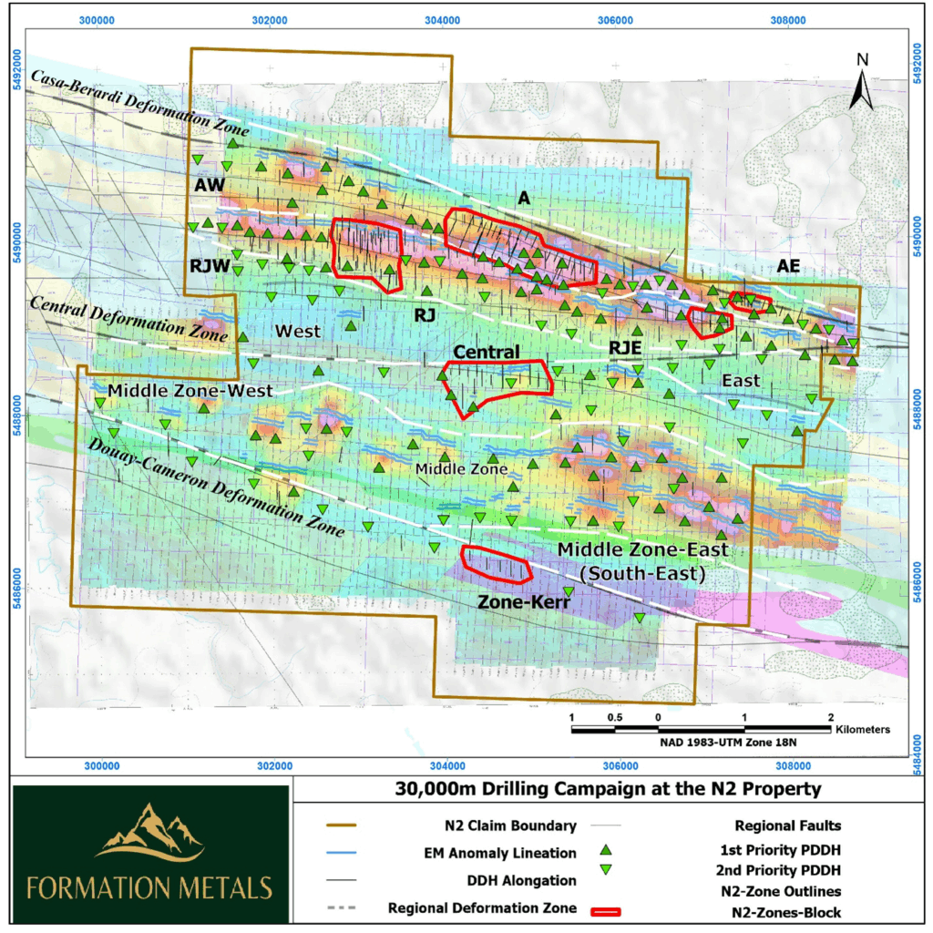 Ein Nachzügler im Goldsektor ist der kanadische Goldexplorer Formation Metals (WKN: A3D492 | ISIN: CA34638F1053 | Ticker-Symbol: VF1). Sein Hauptexplorationsgebiet ist mit 4,400 ha das sogenannte N2-Goldprojekt in der kanadischen Provinz Quebec. Das Projektgebiet befindet sich nur 1,5 km östlich der Vezza Goldmine, in der ein gleichwertiges mesodermales Goldsystem zu finden ist. Auf dem Projektgebiet wurden bereits 236 Diamantbohrungen vorgenommen und 55.517 Bohrmeter gebohrt. Daraus ergeben sich in zwei Abschnitten mit 871.000 Goldunzen als historische Ressourcen , die in der Länge wie auch Tiefe noch weiter exploriert werden können und sollen.