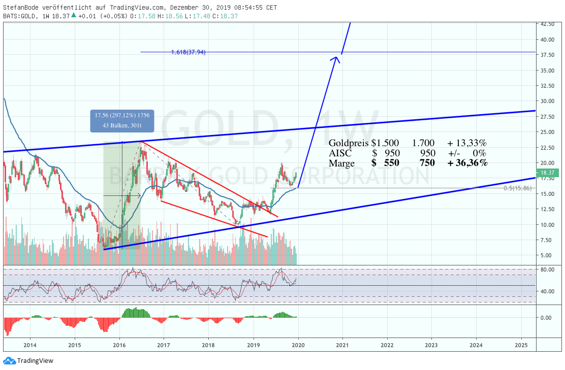 Die Begründung liegt darin, dass die Kosten der Goldproduktion relativ konstant bleiben bzw. nur moderat ansteigen. Steigt also der Goldpreis um $ 200 auf $ 1.700 (13%) an, steigt dadurch die Gewinnmarge des jeweiligen Produzenten fast 1 zu 1 um diese 200 $. Bei Barrick Gold würde die bisherige Marge von ca. $ 550 auf $ 750 je Unze ansteigen, was einem Gewinnwachstum von über 36 Prozent entsprechen würde. Und da die Börse diesen erwarteten Margenanstieg vorwegnehmen wird, sollte sich der Aktienkurs von Barrick Gold in 2020 mehr als verdoppeln. In dem beigefügten Chart ist als erster Zielbereich die $ 38 ausgegeben. In den kommenden Jahren sind sogar noch deutlich höhere Notierungen zu erwarten und neue Allzeithochs können ausgebildet werden.