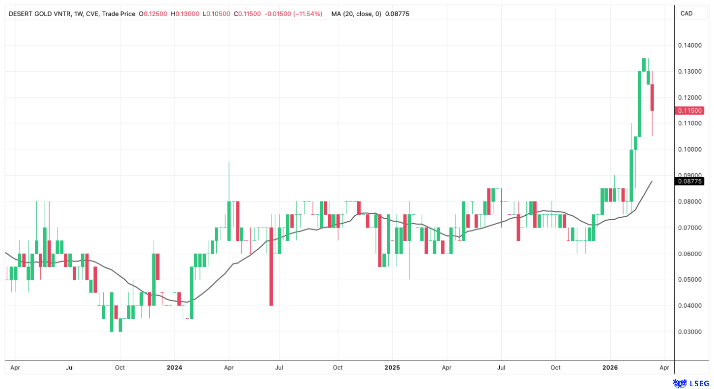 Das Analyseunternehmen GBC AG geht in seinem aktuellen Research vom 18.03.2026 davon aus, dass Desert Gold durch Reinvestitionen der Erträge aus dem zweiten Halbjahr 2026 im ersten vollen Produktionsjahr 2027 ca. 432.000 t Erz verarbeiten und daraus 11.600 Unzen Gold gewinnen kann. Das angenommene EBITDA würde dann in 2027 bis 2035 bei jährlichen 20,19 Mio. USD (27,66 Mio. CAD) liegen. Nach Abzug von Steuern und anfänglichen Investitionsausgaben rechnen deren Analysten Greiffenberger und Filker mit einem freien Cashflow von jährlich 16,29 Mio. USD (22,29 Mio. CAD). Dies summiert sich bis 2035 auf eine Summe von 155,9 Mio. USD (213,58 Mio. CAD). Bei einer Abdiskontierung dieser Summe mit 10 % p.a. ergibt sich ein aktueller Kapitalwert allein für dieses Projekt von 89,6 Mio. USD (122,75 Mio. CAD). Bezogen auf die aktuelle Marktkapitalisierung von 32,46 Mio. CAD ergibt sich eine Unterbewertung der Aktie - nur für dieses Teilprojekt - von 378 %!