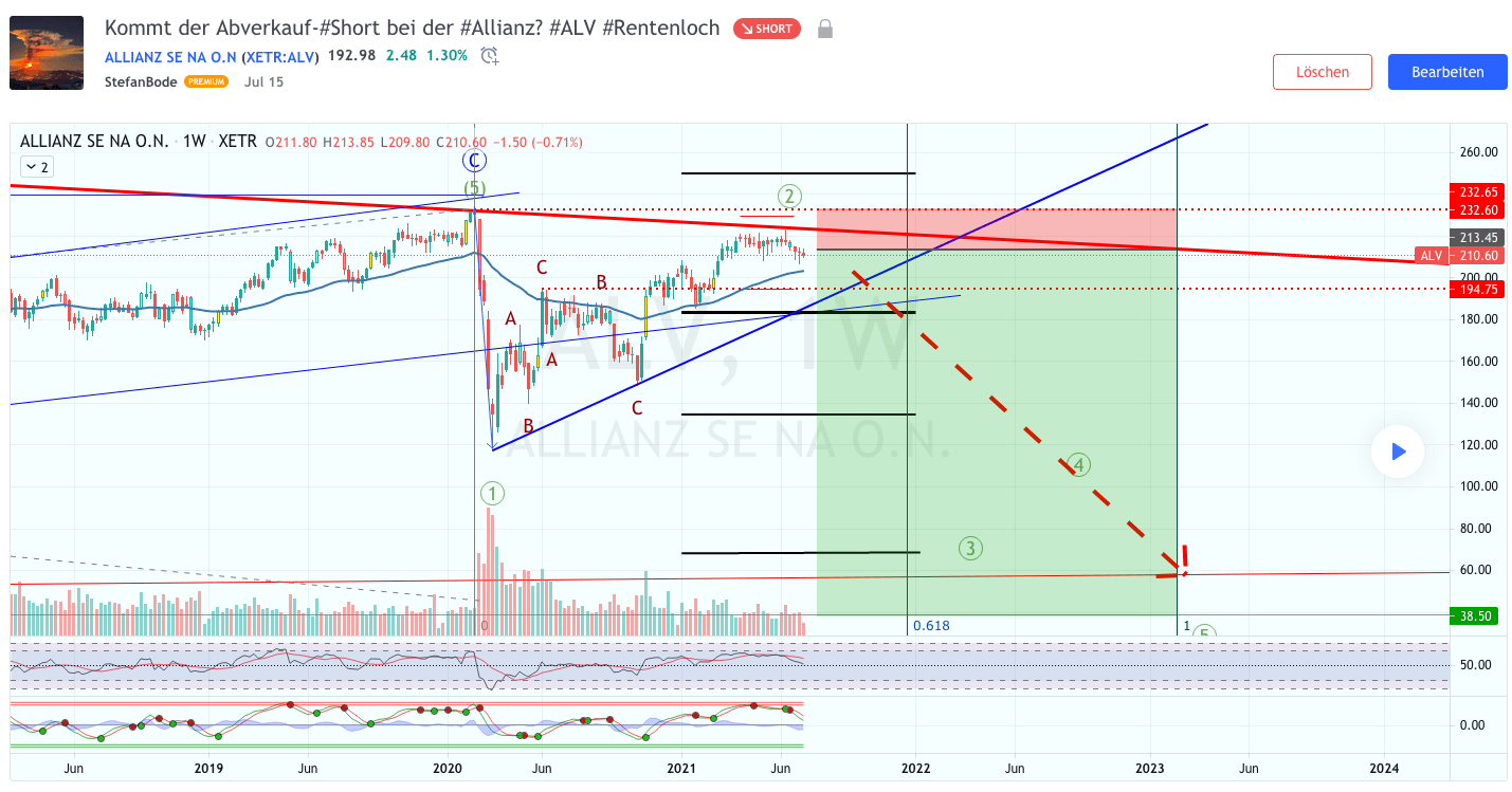 Fundamental betrachtet gäbe es mehrere Gründe. Wie am Sonntag heraus kam, ermittelt neben der US Aufsichtsbehörde SEC auch das US Justizministerium gegen Allianz Global Investors. Hintergrund sind die strukturierten Geschäfte in den USA mit den Structure Alpha Fonds, die teilweise zu Totalverlusten der Investoren führte. Alleine hier sollen laut anonymen Mitteilungen ca. 6 Mrd. USD bereits jetzt an Klagen vorliegen. Auch die Überschwemmungen und Flutkatastrophe in Rheinland-Pfalz und Nordrhein-Westfalen werden die Bilanz mit mindestens 1 Mrd. EUR Entschädigungsumme belasten. Aktuell rechnet der Vorstand Oliver Bäte noch mit einem Konzerngewinn von ca. 12 Mrd. EUR. Doch allein die Klagen aus den USA würden den Gewinn sofort halbieren.