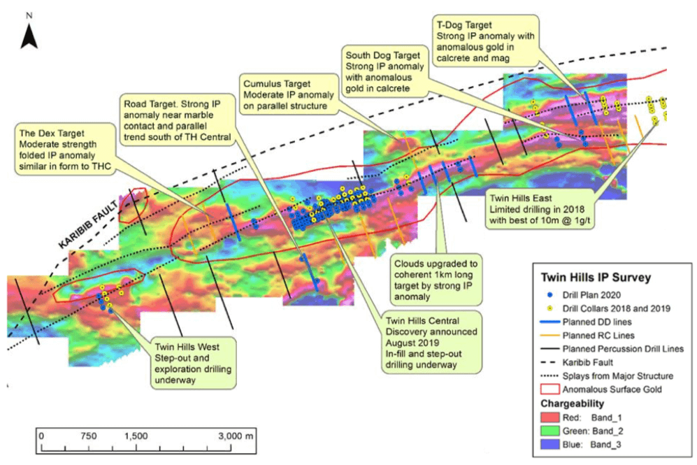 Osino Resources hat eine IP-Untersuchung (induzierte Polarisation) über das Twin Hills-Zwillingshügel-Projekt mit einer Gesamtfläche von 16 Quadratkilometern abgeschlossen. Die Untersuchung hat eine ganze Reihe neuer Bohrziele unterhalb der bestehenden Kalksteindecke ergeben und somit die bereits bekannten Goldzielgebiete deutlich erweitert und verstärkt. Dabei wurden die Claims von Greg Symons Geophysics analysiert und kartografiert, so dass Osino Resources jetzt ganz genau weiß, wo die nächsten Bohrungen durchgeführt werden und bis in welche Mindesttiefe diese erfolgen müssen. Außerdem zeigen die Ergebnisse der induzierten Polarisation, dass die parallel verlaufenden unterirdischen Goldstrukturen eine Streichlänge von sage und schreibe 11 km haben dürften.