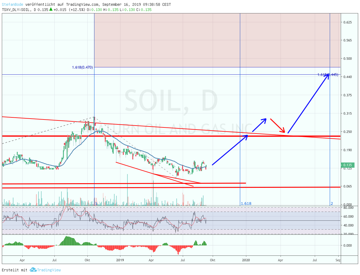 Dieser Titel hatte eine phantastische Gewinnmarge im ersten Halbjahr 2019 von 28,44% je verkauften Barrel Öl. Genau jener Gewinnanteile könnte sich bei einen durchschnittlichen Ölpreisanstieg um $5/Barrel auf über 34% erhöhen. Zwar ist die Aktie seit der letzten Veröffentlichung am 30.08.2019 bereits um 8% auf 0,135 CAD / 0,10 Euro gestiegen, jedoch liegt das Potential der Aktie nach wie vor bei 0,24 CAD / 0,16 Euro. Sollte der dortige Widerstandsbereich mit Monatsschlußkurs über 0,28 CAD / 0,17 Euro aus dem Markt genommen werden, stünde einer Neubewertung der Aktie nichts mehr im Weg.