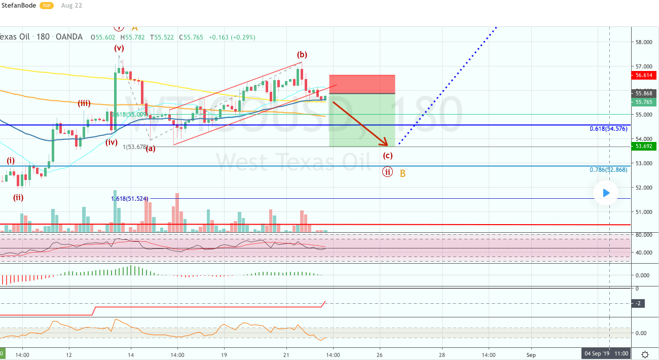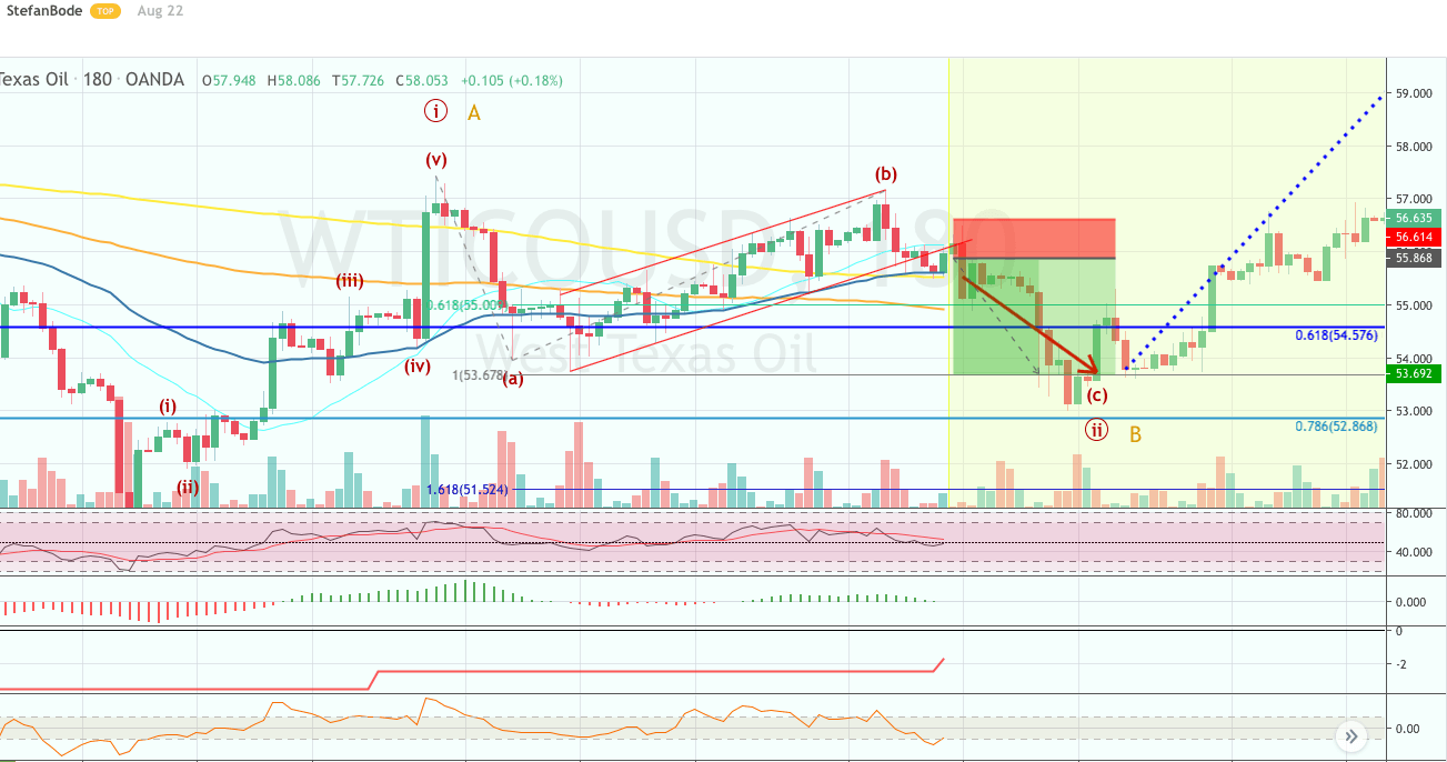 Hier sieht man die Erwartungshaltung des Autors von WTI am 22. August 2019 und darunter die tatsächliche Entwicklung des Ölpreises von WTI in den folgenden Tagen bis Ende August.
