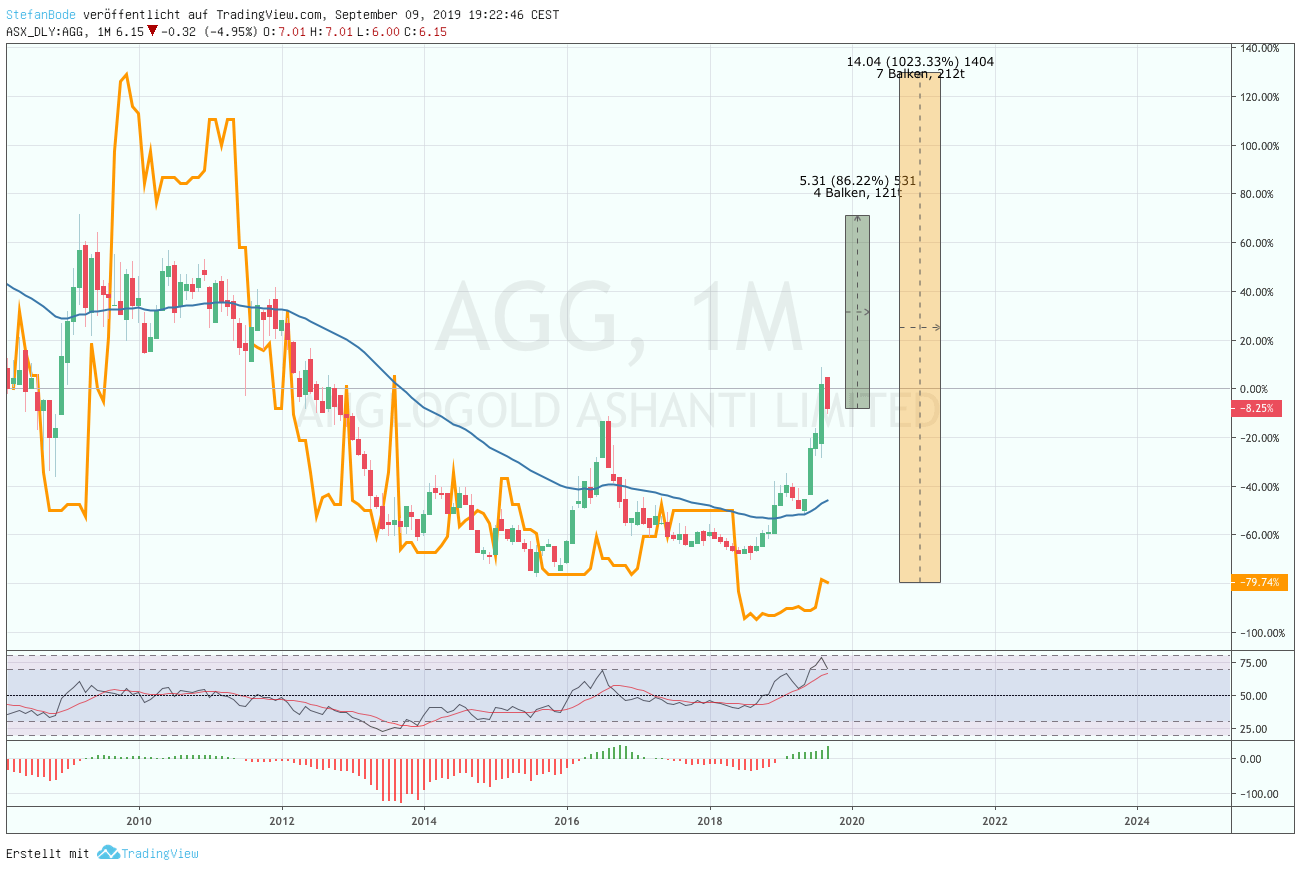 Schaut man sich die Entwicklung der sehr unterschiedlichen Unternehmen (Explorer versus Produzent) an, so sieht man doch eine dem Goldpreis geschuldeten Korrelation. Während AngloGold als Produzent bereits ein höheres Hoch im Vergleich zu 2016 ausgebildet hat und vom steigenden Goldpreismargen profitiert, so ist Osino Resources trotz guter Performance der letzten 4 Wochen als Explorer noch meilenweit davon entfernt und stark abhängig von guten Bohrergebnissen.