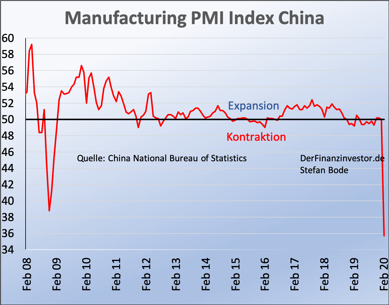 Der PMI für des verarbeitenden Gewerbe schwankt bereits seit Nov. 2018 um die Stagnationslinie von 50 Prozent war in den letzten 16 Monaten nur 4 Monate leicht oberhalb dieser Linie. Im Januar 2020 lag der Wert bei 50 und bedeutet Stagnation in der chinesischen Produktion. Im Februar brach dieser Wert jedoch auf unvorstellbaren 35,7 Prozent ein: