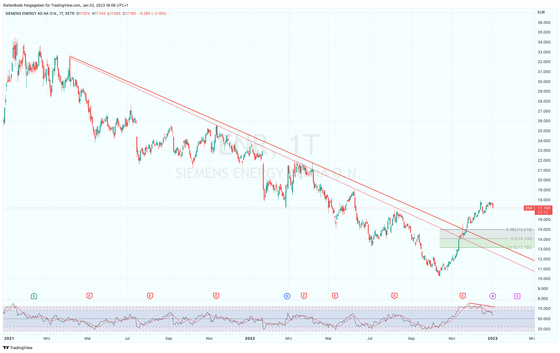 Mit dem Tief vom 13. Oktober 2022 konnte Siemens Energy (WKN: ENER6Y ISIN: DE000ENER6Y0 Ticker: ENR) den Trendwechsel von Bärenmarkt auf Bullenmarkt vollziehen. Das Tief lag vor zweieinhalb Monate bei 10,25 EUR und seitdem konnte die Aktie um 67,9 % auf 17,21 EUR je Anteilsschein ansteigen. Damit konnte auch der seit Anfang 2021 etablierte Abwärtstrend nachhaltig überwunden werden, auch wenn nach so einem starken Ausbruch oftmals noch ein Rücksetzer auf das Ausbruchsniveau erfolgt. Der übersprungene Abwärtstrend verläuft derzeit bei ca. 13,70 EUR und kann durchaus noch einmal erreicht werden. Sollte es zu einem Kursrücksetzer von 61,8 % der bisher gelaufenen Aufwärtsbewegung kommen, wären sogar 13,19 EUR noch möglich.