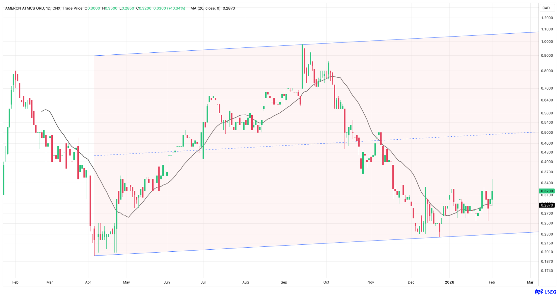 Wer auf den langfristigen Anstieg der Nachfrage nach Uran und den Ausbau der Kernenergie setzen will, für den dürfte die Aktie von American Atomics interessant sein. Vom aktuellen Preisanstieg des Uranpreises ist im Chart des Unternehmens bisher noch nicht viel zu sehen und das bietet Investoren die Chance, mit dem ausgebildeten Boden zwischen 0,25 CAD bis 0,30 CAD die Aktie günstig einsammeln zu können. Da das Apriltief vom letzten Jahr bei 0,20 CAD und das Septemberhoch bei 0,98 CAD lag, ergibt sich für strategische Investoren zudem ein sehr interessantes Chancen-Risiko-Verhältnis (CRV). Bei einem Einstieg zu 0,30 CAD und einem Stoppkurs bei 0,19 CAD mit einem Anstiegspotenzial auf 0,98 CAD beträgt das CRV sehr interessante 6:1.